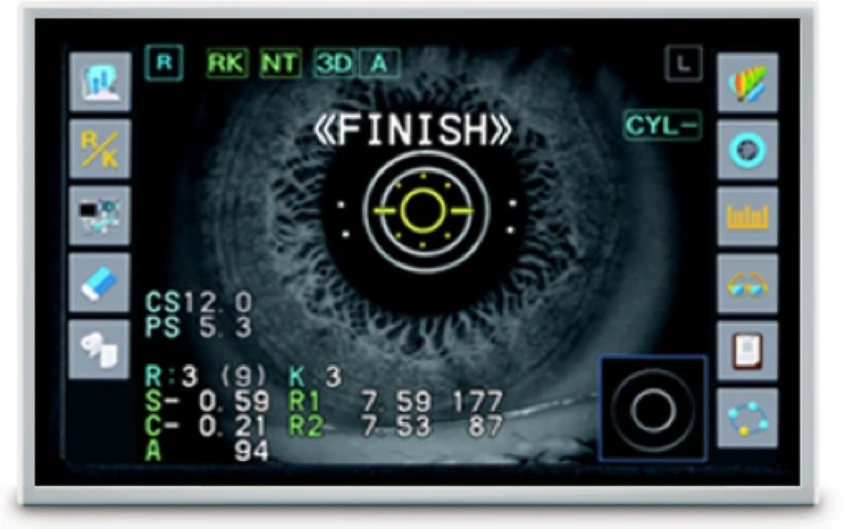 Refraktion, Keratometrie, Non-Contact-Tonometrie und Pachymetrie können direkt hintereinander ausführt oder auch einzeln angewählt werden.